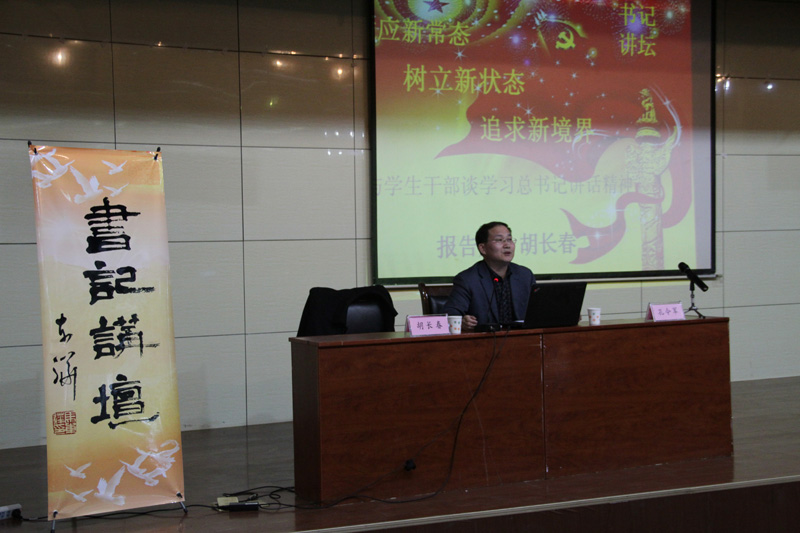 48日下午,“书记讲坛第五讲在日照校区图书馆报告厅开讲,地理与旅游学院党总支书记胡长春作了题为《适应新常态,树立新状态,追求新境界—与学生干部谈学习习近平总书记系列讲话精神体会》的报告,日照校区校级学生组织骨干成员、各学院主要学生干部代表共同聆听了报告。报告会由日照校区机关党总支书记学生工作办公室主任孔令军主持。