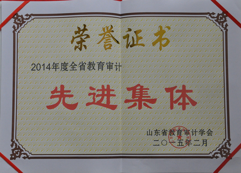 2014年12月至2015年1月,山东省教育审计学会在全省教育系统开展了教育审计先进集体和先进工作者的评选活动。经过全省104所高校推荐和专家评审,学会授予24所高校审计单位“2014年度全省教育审计先进集体”荣誉称号,我校审计处获此殊荣。