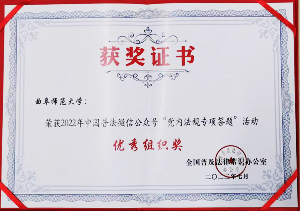 曲阜师大新闻中心讯(通讯员:魏泽中)为深入推进党内法规学习宣传,中国普法微信公众号举办了为期30天的党内法规专项答题活动。本次活动共设置个人优胜奖7500名,对组织好的100家基层单位进行表扬。我校荣获2022年中国普法微信公众号“党内法规专项答题”活动优秀组织奖。