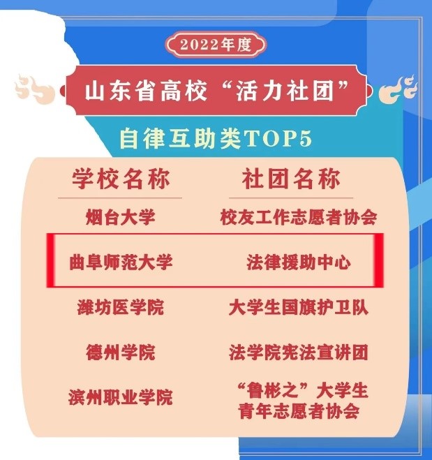 曲阜师大团委讯 近日,在2022年度山东省高校“活力团支部”“活力社团”风采展示活动中,我校文学院汉语言文学(公费师范)2021级8班团支部荣获山东省高校“活力团支部”、法律援助中心荣获山东省高校“活力社团”。