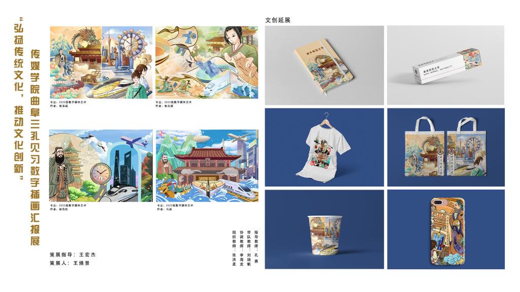 此前,传媒学子游览“三孔”景区,深层次近距离学习与领悟孔子文化、儒家文化的精髓,并将之作为创作源泉,创作出一大批精美的数字插画、文创延展作品。创作作品兼顾艺术性与思想性,将传统文化与现代审美、学校特色、学院特长相结合,通过多种创作手法、符号元素、传播形式,将儒家文化巧妙的呈现在多元化载体上。此次活动为学生深入了解优秀传统文化提供了平台,为擦亮传统文化办学特色贡献了传媒力量。