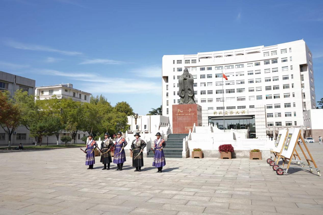 交流会后,广东省社科院、体育局一行来到孔子文化广场,观看了五人箭阵表演。