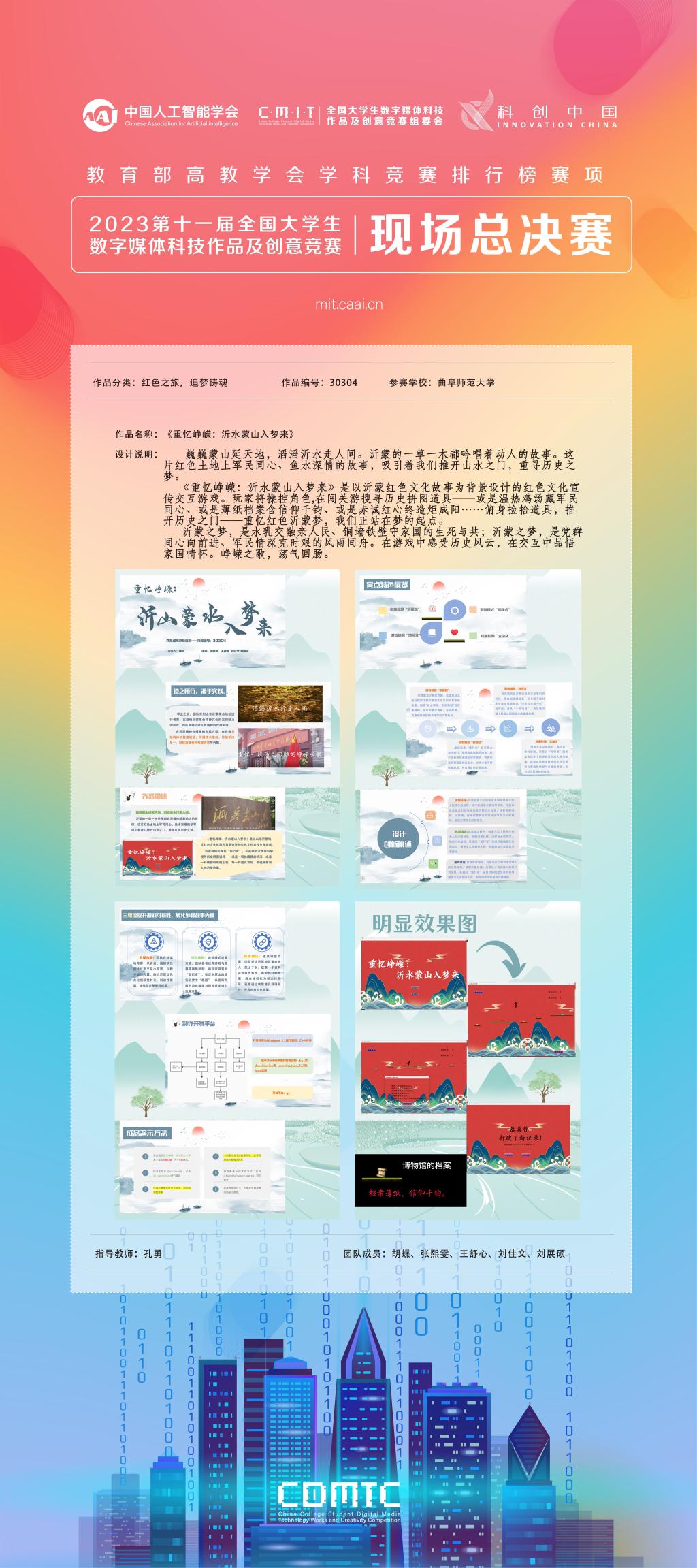 曲阜师大传媒学院讯   近期,第十一届全国大学生数字媒体科技作品及创意竞赛现场总决赛结果揭晓。曲阜师大传媒学子在本届大赛中斩获佳绩,共获得国赛一等奖2项、二等奖3项,教师孔勇获国赛一等奖优秀指导教师荣誉称号。