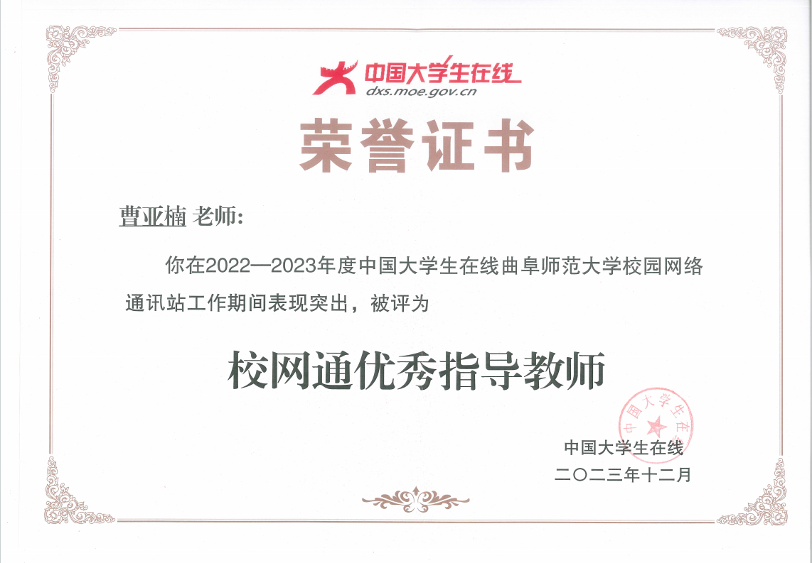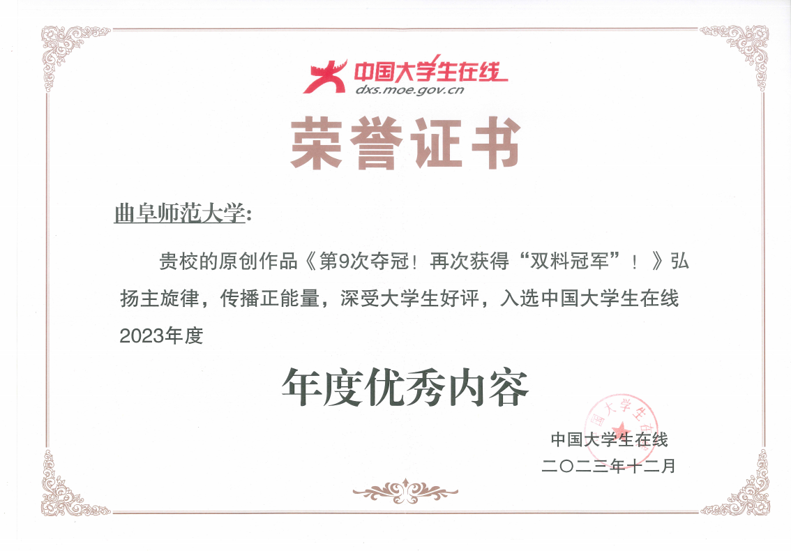 曲阜师大学生工作处讯 近日,中国大学生在线平台发布了《中国大学生在线校网通及校园行活动2023年度表彰名单》,曲阜师大获得多项荣誉。曲阜师大中国大学生在线网通站——万象城官方网站学工在线获“优秀校网通站”称号,曲阜师大学生工作处获“校园行新星单位”称号,原创作品《第9次夺冠!再次获得“双料冠军”!》获评“年度优秀内容”,学生工作处曹亚楠老师获“校网通优秀指导教师”称号,心理学院学生、曲阜师大中国大学生在线校网通站站长刘娣获“优秀校园媒体人”称号。