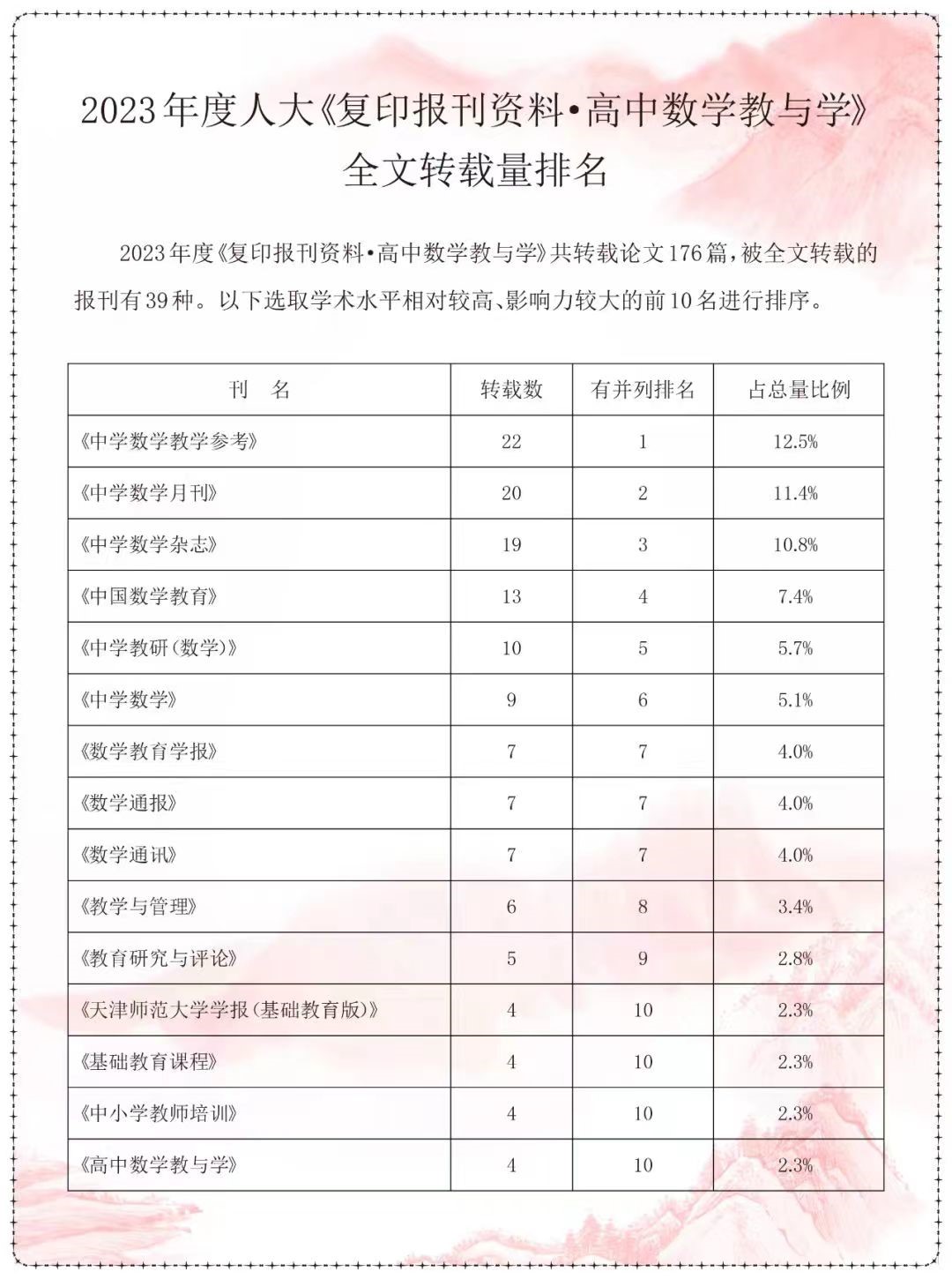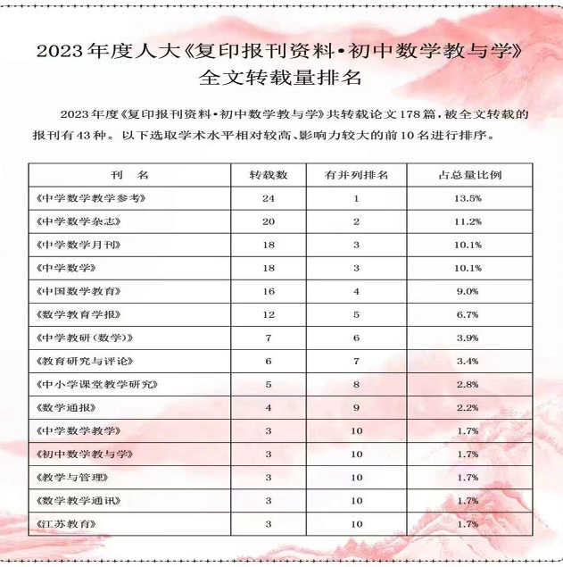 曲阜师大《中学数学杂志》讯 近日,根据中国人民大学书报资料中心全文数据库检索情况,万象城官方网站《中学数学杂志》被《复印报刊资料》系列刊(2023年度)全文转载的文章39篇。《复印报刊资料·初中数学教与学》共转载论文178篇,被全文转载的报刊有43种,《中学数学杂志》(初中版)被转载20篇,占总量的11.2%,第2名;《复印报刊资料·高中数学教与学》共转载论文176篇,被全文转载的报刊有39种,《中学数学杂志》(高中版)被转载19篇,占总量的10.8%,排名第3;全年总转载数39篇,第2名;杂志全年总发文数184篇,被转载比全国同类期刊第1。