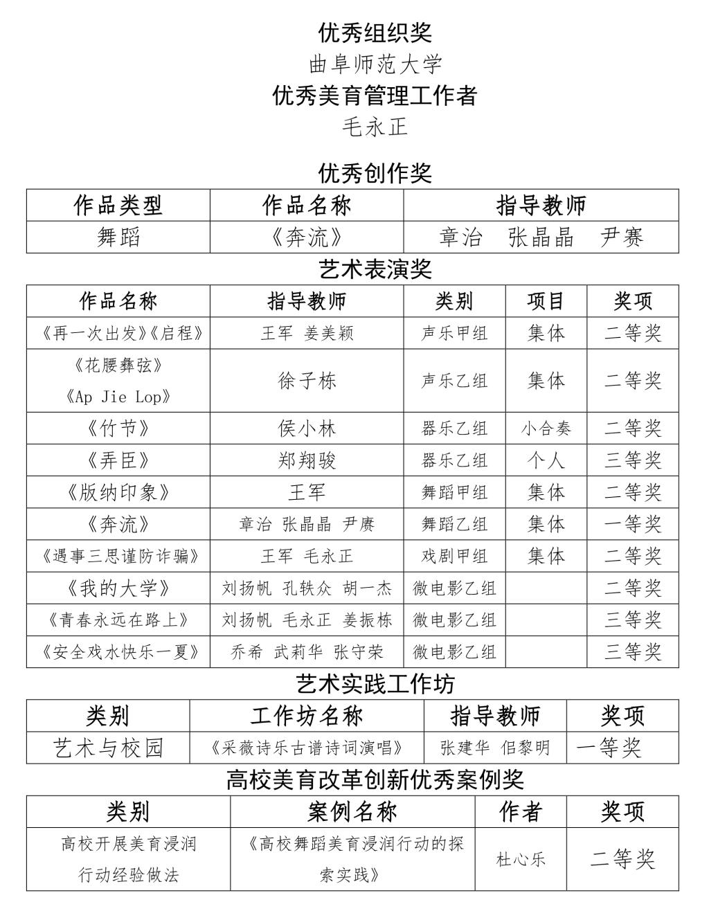 曲阜师大学生工作处讯 近日,山东省教育厅公布了第七届大学生艺术展演获奖名单,我校在本次艺术展演中获得佳绩,共有15件作品获得10个类型的13项奖励。学校荣获优秀组织奖,毛永正被评为优秀美育管理工作者。
