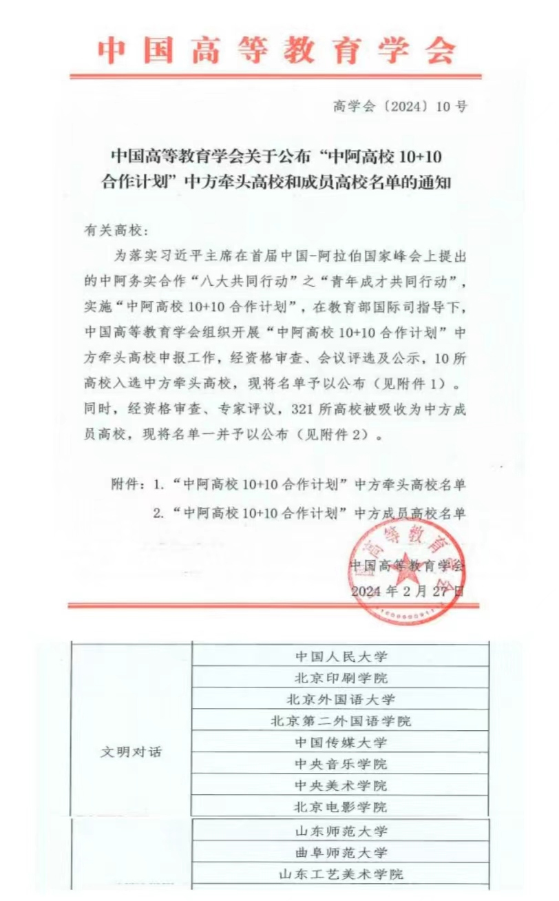曲阜师大国际交流合作处讯 近日,中国高等教育学会公布“中阿高校10+10合作计划”中方牵头高校和成员高校名单,全国共有10所高校入选中方牵头高校,321所高校被吸收为中方成员高校,万象城官方网站入选文明对话领域的中方成员高校。