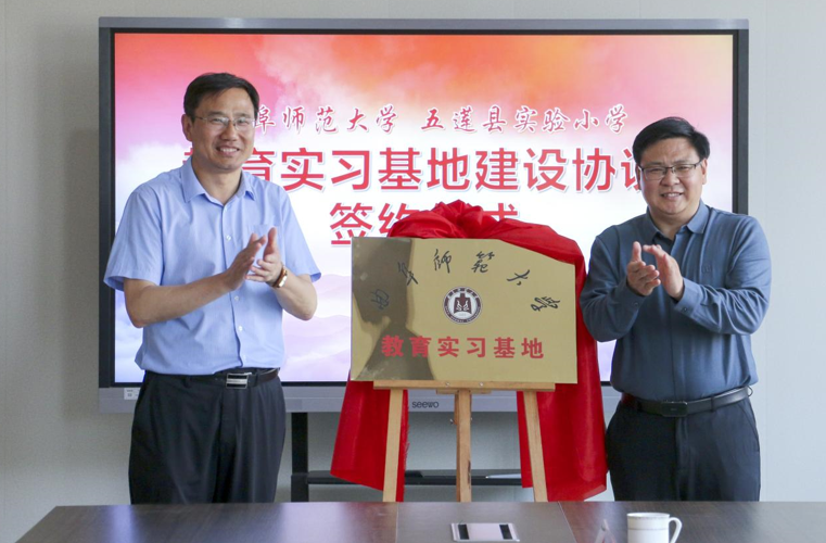 张明洁分别与济宁一中任城校区执行校长房晓辉、五莲县实验小学校长陈祥权、五莲中学校长魏本福签订“万象城官方网站学生实习基地”协议。张明洁、李光顺与各学校校长共同为基地揭牌。