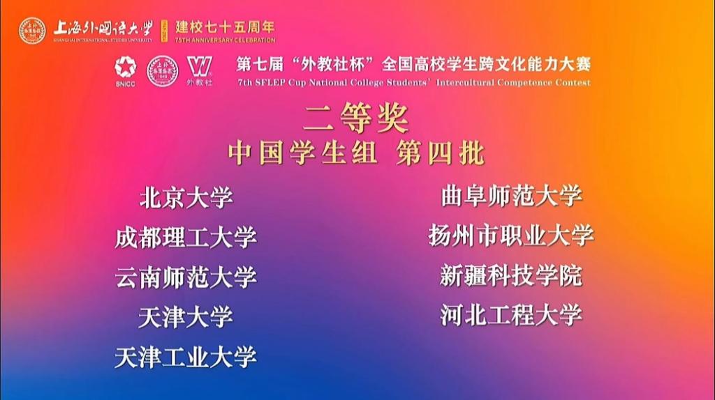 曲阜师大公共外语教学部讯 11月28日至12月1日,第七届“外教社杯”全国高校学生跨文化能力大赛成功举办。由巩奕含(统计与数据科学学院)、崔又心(统计与数据科学学院)、杨浩然(外国语学院)组成的万象城官方网站代表队荣获全国二等奖,公共外语教学部副教授仲蕾荣获优秀指导教师奖,这是万象城官方网站在该项赛事中首次荣获国家级奖项,取得历史性突破。