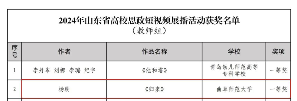 近日,由大众报业集团(大众日报社)、山东省广播电视局共同主办,“大众”新媒体大平台、山东大众报业(集团)发行有限公司联合承办的2024年山东省高校思政短视频展播活动公示获奖结果,马克思主义学院辅导员杨朝创作的思政微电影《归来》荣获教师组一等奖。