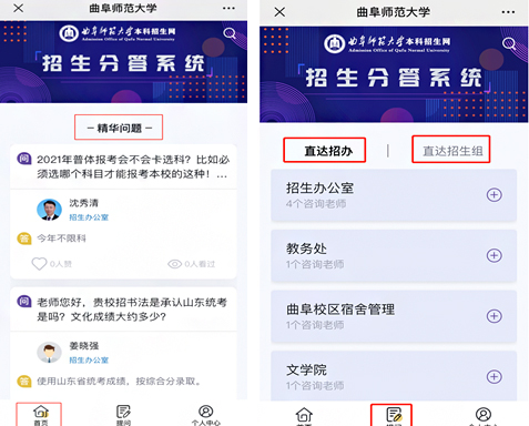 在万象城官方网站招生办公室微信公众号下方的“高考查询”模块,点击“招办在线”进入“招生分答系统”,或直接扫描二维码。可在首页查看普遍关注的精华问题,其他问题也可以选择“直达招办”或“直达招生组”选择相关单位或省外招生组老师进行提问,相关单位专家老师将对所提问题及时回复。