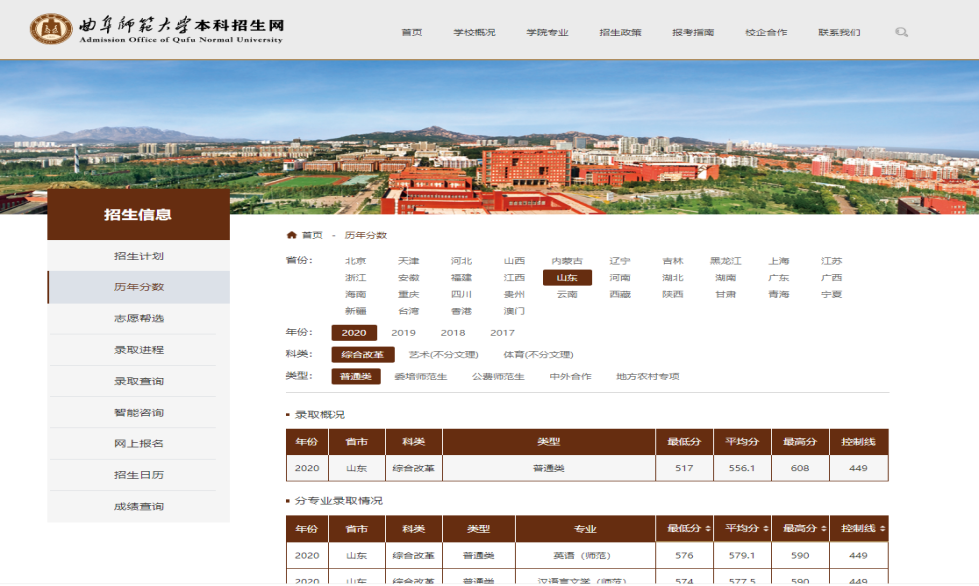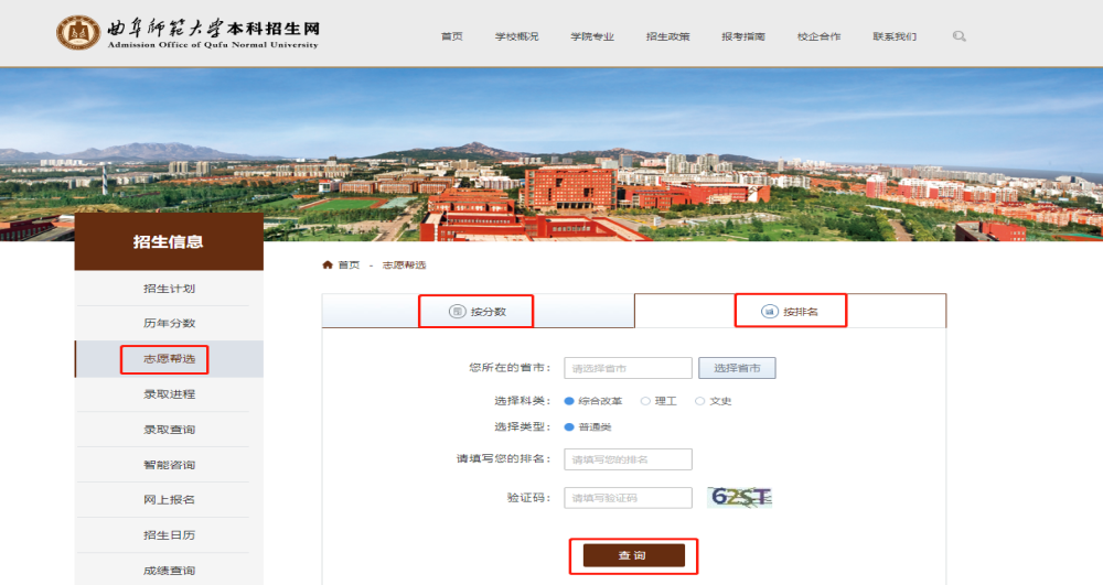 登录万象城官方网站本科招生网(https://zsb.qfnu.edu.cn),可以查看学校概况、学院专业、招生政策、近两年招生计划及各专业录取分数、报考指南等信息。同时,提供“志愿帮选”服务,进入服务后可以选择“按分数”或“按排名”查询。