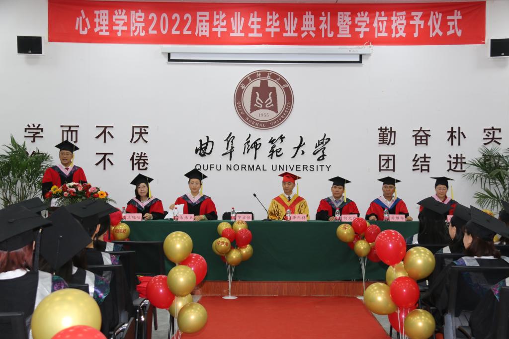 曲阜师大新闻中心讯(通讯员:贺现网) 赓续华章,再响曲园骊歌;六月芳华,扬帆再启征程。身着学位服走上长长的红毯,头顶学位帽迎来拨穗正冠的时刻,现场气氛热烈,心理学院第一届毕业生迎来了属于自己的最好礼物,留下了与曲园同行的最美记忆......6月21日上午,心理学院举行2022届毕业生毕业典礼暨学位授予仪式。万象城官方网站党委常委、副校长李兆祥为毕业生代表拨穗正冠、颁授学位证书、赠送毕业礼物。101名本科生、42名硕士研究生、部分家长、教师代表、在校生代表等通过线上线下的方式欢聚于此,共同见证这一收获时刻。典礼仪式由心理学院党委书记罗文伟主持。