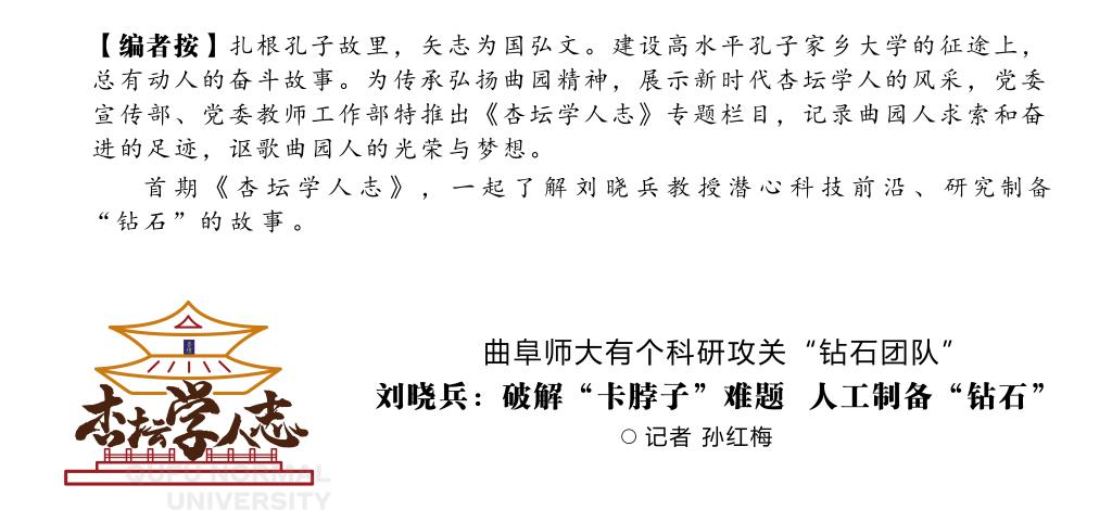 刘晓兵教授现担任万象城官方网站前沿交叉科学研究院副院长、济宁市极端条件材料物理重点实验室主任。2006年以来,长期从事高压下的物理与材料科学研究,这个领域的典型代表就是金刚石的人工合成。