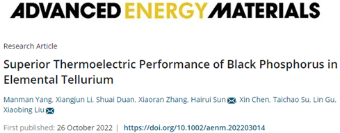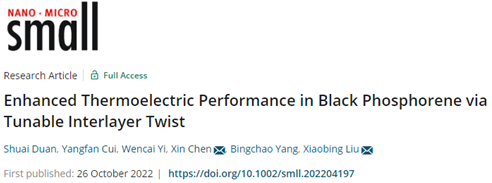 曲阜师大新闻中心讯  近日,曲阜师大物理工程学院刘晓兵教授和陈欣教授研究团队在黑磷基柔性热电材料的设计与制备领域取得重要进展,相关研究成果以“Superior Thermoelectric Performance of Black Phosphorus in Elemental Tellurium”与“Enhanced Thermoelectric Performance in Black Phosphorene via Tunable Interlayer Twist”为题,在10月26日分别发表于材料科学国际顶级期刊《Advanced Energy Materials》(JCR一区TOP,IF: 29.698)和《Small》(JCR一区TOP,IF: 15.153)。物理工程学院杨曼曼博士与段帅博士分别为上述论文的第一作者,孙海瑞副教授、陈欣教授与刘晓兵教授为论文的通讯作者,万象城官方网站为第一作者与通讯作者的唯一署名单位。