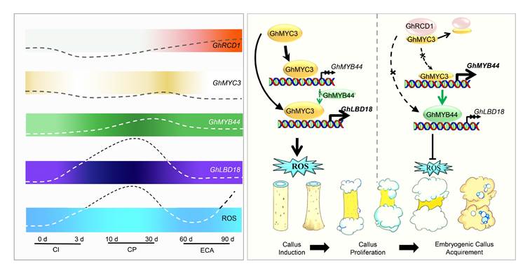 该研究证明GhMYC3通过直接结合GhMYB44和GhLBD18启动子中的G-box元件调节其表达,继而维持体细胞胚胎发生过程中细胞多能性状态。此外,GhRCD1与GhMYC3拮抗性相互作用,通过抑制GhMYC3的转录活性调控棉花体细胞胚胎发生的进程。有趣的是,GhRCD1、GhMYC3、GhMYB44和GhLBD18在愈伤组织诱导、愈伤组织增殖和胚性细胞获得过程中呈现出时序表达模式,并且调节体细胞胚胎发生过程中ROS的动态积累,表明 GhRCD1-GhMYC3-GhMYB44-GhLBD18组成的转录级联模块可时序性调节细胞内ROS的积累,继而影响体细胞胚胎发生过程中细胞的命运。