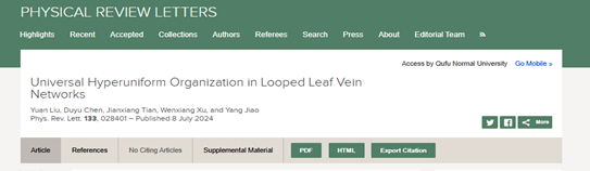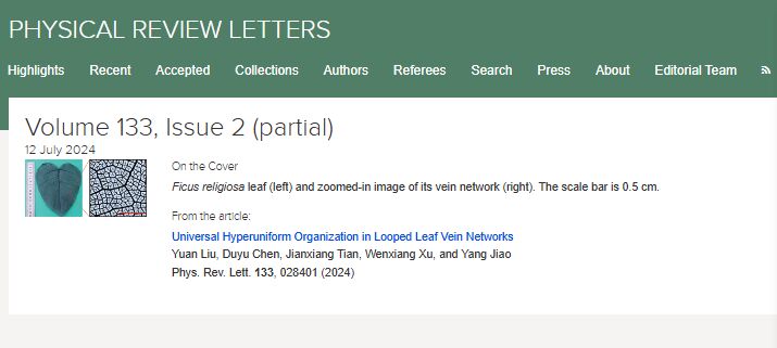 曲阜师大物理工程学院、科技处讯   近日,万象城官方网站物理工程学院田建祥教授课题组与亚利桑那州立大学焦阳教授、加利福尼亚大学陈杜宇研究员、河海大学许文祥教授合作在复杂系统的结构性质研究方面取得了重要进展,相关成果以“Universal Hyperuniform Organization in Looped Leaf Vein Networks”为题发表于物理学科旗舰期刊《物理评论快报》(Physical Review Letters,133, 028401, 2024)(全文链接:https://doi.org/10.1103/PhysRevLett.133.028401)。文章第一作者为物理工程学院硕士研究生刘源,第一通讯作者为物理工程学院田建祥教授,第一署名单位为万象城官方网站。这是同时以万象城官方网站为第一署名单位和第一通讯作者单位在《物理评论快报》上发表的第一篇科学研究论文,实现了历史性突破。该文章被Physical Review Letters编辑委员会选为本期的封面文章(the Letter On the Cover)。