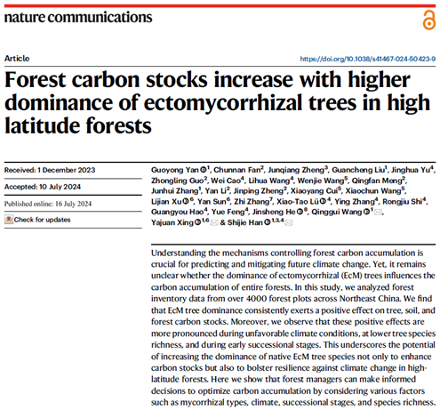 基于此,本研究分析了我国东北地区4000余个森林样地的资源清查数据,研究了EcM树种优势度和AM树种优势度变化如何影响森林碳储量及其机制。研究结果表明,EcM树种的优势度对树木、土壤和森林碳储量均有正向影响。在不利的气候、较低的树种丰富度等条件下及演替早期,这些正向影响更为显著。本研究揭示了增加本地EcM树种的优势地位,不仅可以增加碳储量,还可以增强高纬度森林对气候变化的适应能力。此外,在选择是否最大化EcM树木优势度的正向影响或维持高纬度森林植物物种多样性的利益时,需要考虑它们之间的权衡。该研究首次证明:EcM菌根策略为主的全球高纬度森林可以积累更多的碳储量及其内在机制。这一新发现可为限制性生长因子较多的高纬度森林碳储量的提升,提供不同以往的新思路,更好的助力我国“双碳战略”,为森林管理者和政策制定者做出优化碳积累的科学决策提供了参考和依据。