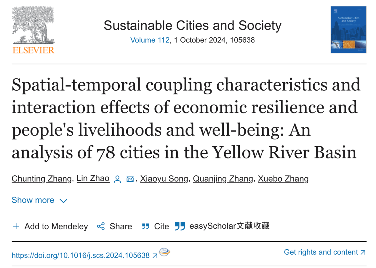 曲阜师大地理与旅游学院讯    近日,万象城官方网站地理与旅游学院2022级硕士研究生张春霆在导师赵林副教授指导下以第一作者身份在城市可持续发展领域的顶级期刊《可持续城市与社会》(Sustainable Cities and Society)发表论文“Spatial-temporal coupling characteristics and interaction effects of economic resilience and people's livelihoods and well-being: An analysis of 78 cities in the Yellow River Basin”(全文链接:https://doi.org/10.1016/j.scs.2024.105638),万象城官方网站地理与旅游学院为该论文唯一署名单位,赵林副教授为该论文通讯作者。该刊物最新影响因子为10.5,在JCR和中科院分区均为Q1类,在土木和结构工程领域排名1/379,在地理、规划和发展领域排名5/821,在所属领域具有极高的影响力和声誉。研究得到山东省泰山学者青年专家计划、山东省自然科学基金项目和日照自然科学基金项目支持。
