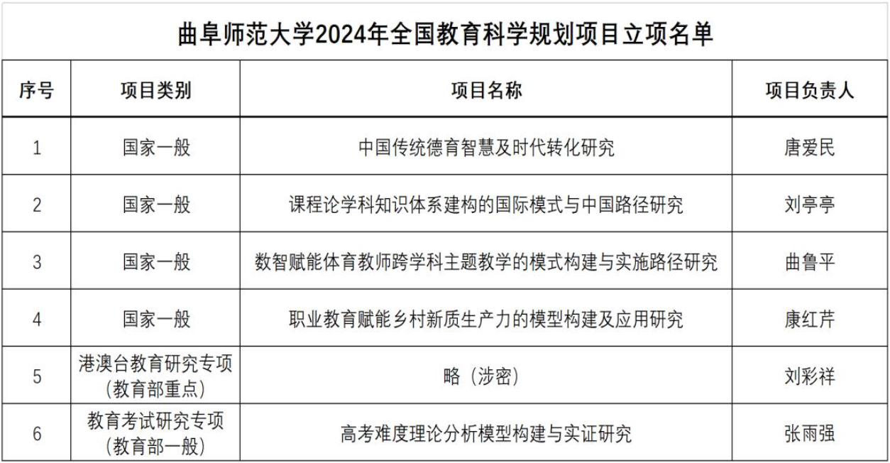 曲阜师大社科处讯  近日,全国教育科学规划办公室公布了2024年全国教育科学规划项目立项名单,曲阜师大共有6个项目获得立项,其中一般项目4项、港澳台教育研究专项1项、教育考试研究专项1项,学校立项总数位列全国高校14位、山东高校第1位。