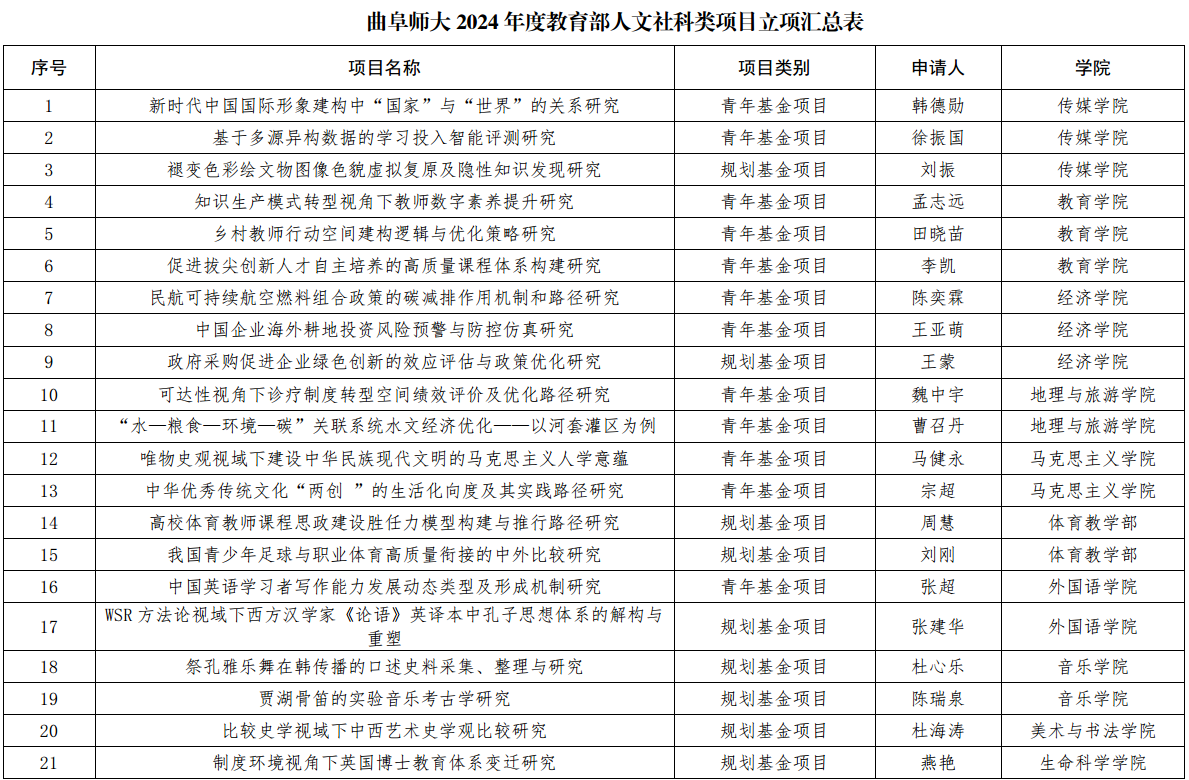 曲阜师大社会科学处讯  近日,教育部社科司正式公布了2024年度教育部人文社会科学研究项目立项名单,曲阜师大共27个项目获批立项,一般项目立项总数并列全国高校第8位,立项总数创历史新高。