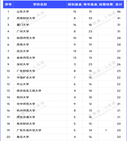 全国高校教育部人文社科一般项目立项数量前20排名(数据来源:高绩)