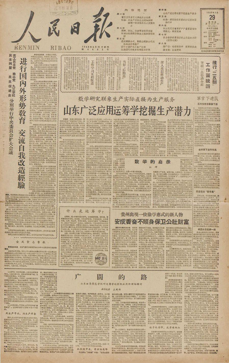 同年7月29日,《人民日报》第一版以《广阔的路》为题,对曲阜师范学院在运筹学的实际应用及理论探讨方面的成果进行了详细介绍,在国内产生了广泛的影响,也为我校运筹学的研究奠定了基础。