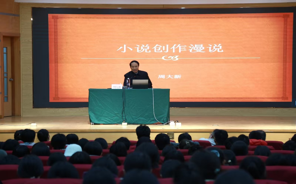 文学院讯  11月24日、25日晚,著名作家、茅盾文学奖得主周大新先生应邀来校为文学院师生分别作了题为《文学与人生》和《小说创作漫谈》的学术报告。文学院党委书记左兴才出席会议,学院师生六百余人参加本次报告会。报告会由文学院教授刘聪、副院长李杰俊分别主持。