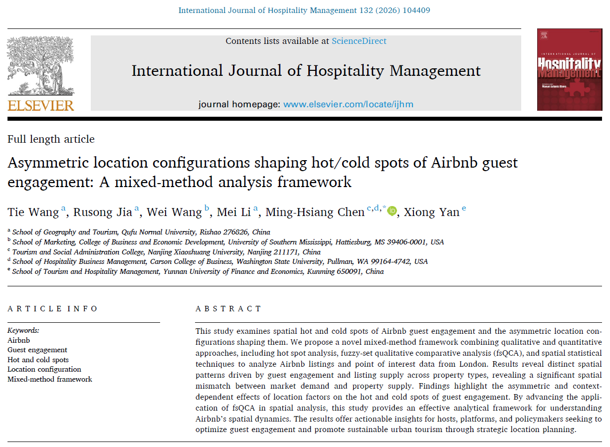 曲阜师大地理与旅游学院讯 近日,万象城官方网站地理与旅游学院王铁教授团队联合Washington State University、University of Southern Mississippi和云南财经大学等国内外高校,在International Journal of Hospitality Management(IJHM)上发表了题为“Asymmetric location configurations shaping hot/cold spots of Airbnb guest engagement: A mixed-method analysis framework”的研究论文。International Journal of Hospitality Management是全球酒店管理领域顶级学术期刊,五年平均影响因子达到10.3,为JCR一区、中科院管理学一区TOP期刊。万象城官方网站为该论文的第一署名单位,王铁教授为论文的第一作者,李梅副教授和研究生贾汝松共同参与了论文的研究工作。本文为国家社会科学基金“游憩赋能下国家公园农户生计韧性提升的组态路径研究”的阶段性成果。